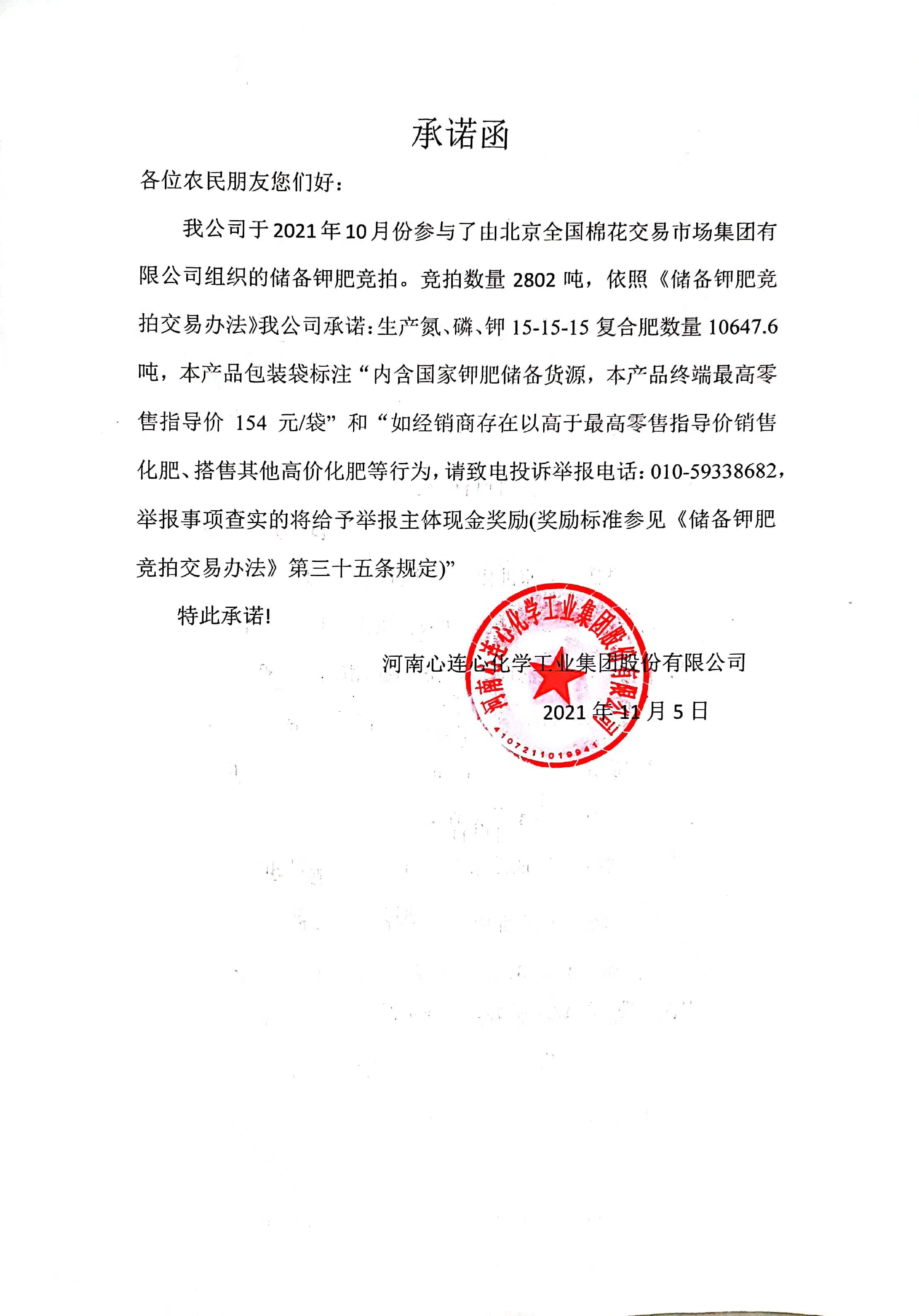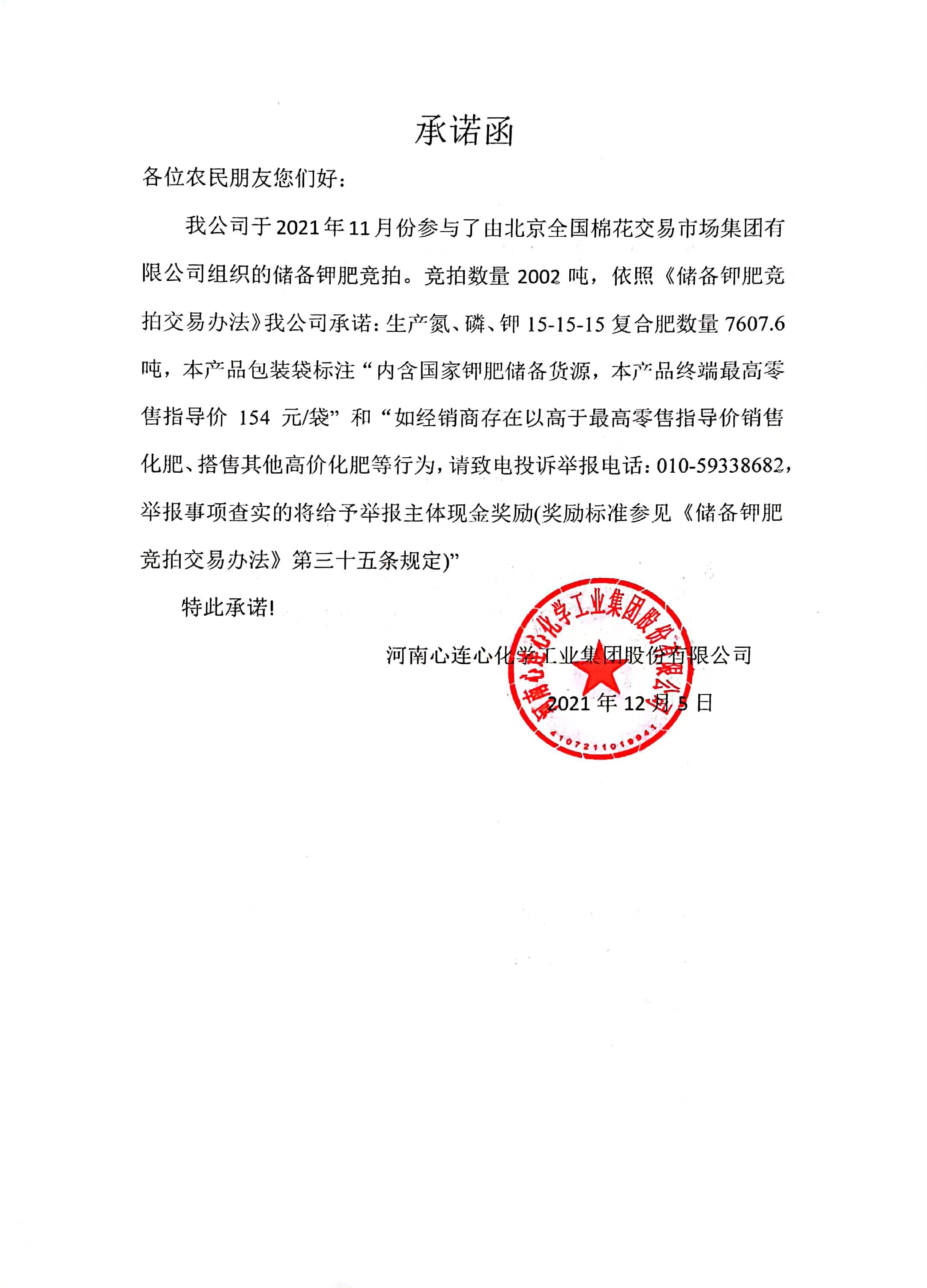 幸运飞行艇官方开奖查询分别于2021年10月、11月份参与了由北京全国棉花交易市场集团有限公司组织的储备钾肥竞拍。依照《储备钾肥竞拍交易办法》公司做出以下承诺,详见附件: